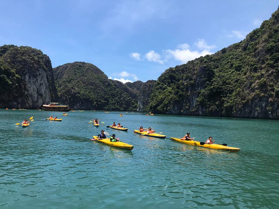 13h30 – 16h00 : Keep cruising to Hang Ca, kayaking through Dark cave, Bat cave and Bright cave. Here you have chance to visit the less-accessed area to get the most exotic scenery to yourself. After 2 hours kayaking, our boat bring you to Three Peachs beach (Ba Trái Đào) to swim, snorkel or lie down on the boat deck for drinking, relaxing and take photographs. Our tour guide and car will take you back to Hanoi capital.